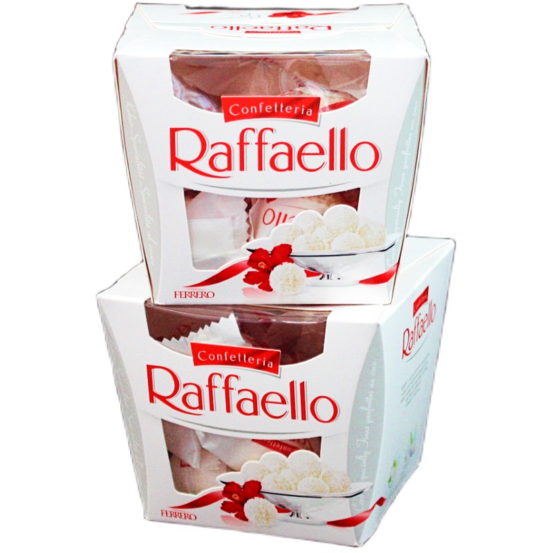 Две коробки конфет Raffaello с цельным орехом в кокосовой обсыпке по 150 грамм каждая. Суммарно 300 грамм конфет от Ferrero.