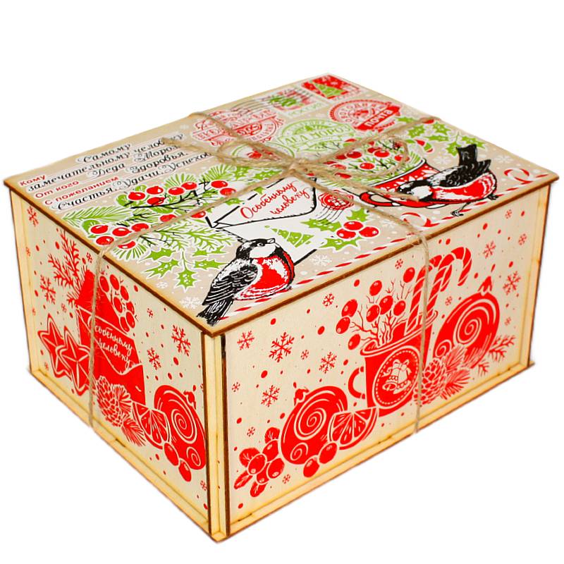 Детский новогодний подарок в упаковке из фанеры весом 1200 грамм