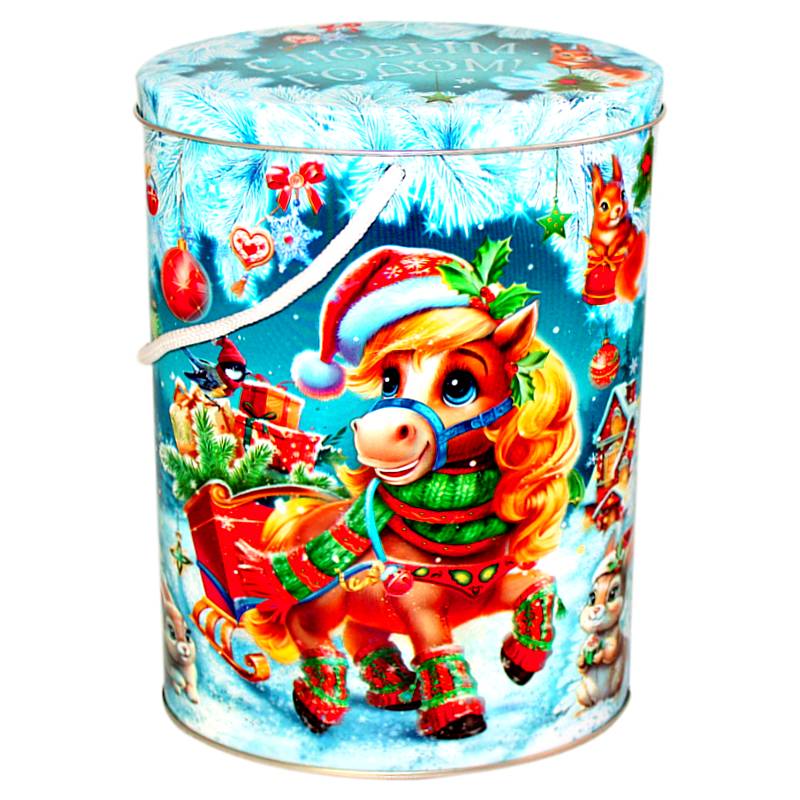 Детский новогодний подарок в жестяной упаковке весом 1000 грамм