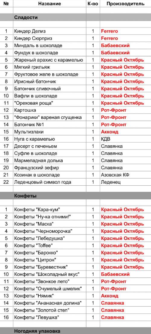 Жареный арахис с карамелью (1 шт), Мягкий грильяж (1 шт), Фруктовое желе в шоколаде (1 шт), Ирисный батончик (1 шт), Батончик сливочный (1 шт), Вафли в шоколаде (1 шт), "Ореховая роща" (1 шт), Конфеты "Кара-кум" (1 шт), Конфеты "Ну-ка отними!" (1 шт), Конфеты "Маска" (1 шт), Конфеты "Черноморочка" (1 шт), Конфеты "Лебедушка" (1 шт), Конфеты "Toffee" (1 шт), Конфеты "Барокко" (1 шт), Конфеты "Цитрон" (1 шт), Конфеты "Буревестник" (1 шт)