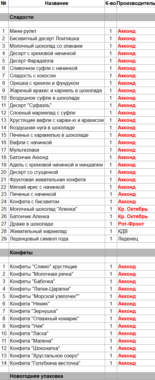 Мини-рулет (1 шт), Бисквитный десерт Ломтишка (1 шт), Молочный шоколад со злаками (1 шт), Десерт с кремовой начинкой (1 шт), Десерт Фараделла (1 шт), Cливочное суфле с начинкой (1 шт), Сладость с кокосом (1 шт), Орешка с кремом и фундуком (1 шт), Жареный арахис и кармель в шоколаде (1 шт), Воздушное суфле в шоколаде (1 шт), Десерт "Суфаэль" (1 шт), Слоеный мармелад с суфле (1 шт), Хрустящие вафли с карам-ю и арахисом (1 шт), Воздушная нуга в шоколаде (1 шт), Печенье с карамелью в шоколаде (1 шт), Вафли с начинкой (1 шт), Мультизлаки (1 шт), Батончик Акконд (1 шт), Адель с кремовой начинкой и миндалем (1 шт), Десерт со сгущенкой (1 шт), Фруктовая жевательная конфета (1 шт), Мягкий ирис с начинкой (1 шт), Печенье с начинкой (1 шт), Конфета с бисквитом (1 шт), Конфеты "Слимо" хрустящие (1 шт), Конфеты "Молочная речка" (1 шт), Конфеты "Бабочка" (1 шт), Конфеты "Лапки-Царапки" (1 шт), Конфеты "Морской узелочек" (1 шт), Конфета "Нямик" (1 шт), Конфета "Зернушка" (1 шт), Конфета "Отважный комарик" (1 шт), Конфета "Уми" (1 шт), Конфета "Ласка" (1 шт), Конфета "Малена" (1 шт), Конфета "Шоконатка" (1 шт), Конфета "Хрустальное озеро" (1 шт), Конфета "Голубкина весточка" (1 шт)