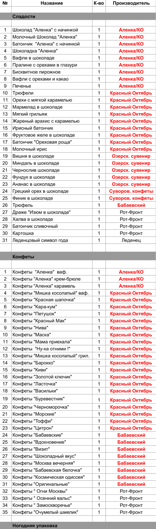 Трюфели (1 шт),Орехи с мягкой карамелью (1 шт),Мармелад в шоколаде (1 шт),Мягкий грильяж (1 шт),Жареный арахис с карамелью (1 шт),Ирисный батончик (1 шт),Фруктовое желе в шоколаде (1 шт),Батончик "Ореховая роща" (1 шт),Молочный ирис (1 шт),Конфеты "Мишка косолапый" ваф. (1 шт),Конфеты "Красная шапочка" (1 шт),Конфеты "Кара-кум" (1 шт),Конфеты "Петушок" (1 шт),Конфеты "Красный Мак" (1 шт),Конфеты "Нива" (1 шт),Конфеты "Маска" (1 шт),Конфеты "Мама приехала" (1 шт),Конфеты  "Ну-ка отними !" (1 шт),Конфеты "Мишка косолапый" грил. (1 шт),Конфеты "Барокко" (1 шт),Конфеты "Киви" (1 шт),Конфеты "Золотой ключик" (1 шт),Конфеты "Ласточка" (1 шт),Конфеты "Васильки" (1 шт),Конфеты "Буревестник" (1 шт),Конфеты "Черноморочка" (1 шт),Конфеты "Морские" (1 шт),Конфеты "Toффи" (1 шт),Конфеты "Цитрон" (1 шт)